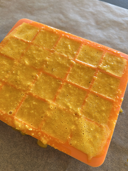 Hier ist Vorsicht wirklich besser als Nachsicht. Kurkuma macht echt gemeine Flecken. Achte daher gut darauf, dass du nichts verschüttest. Aus diesem Grund verwenden wir bereits beim Umfüllen in die Eiswürfelform Backpapier als Unterlage und geben die Eiswürfel samt Backpapier ins Gefrierfach.